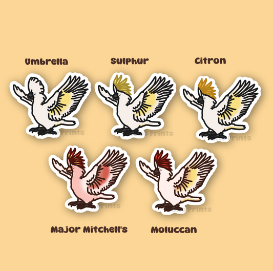 Cockatoo- 3" Waterproof, UV-Resistant Sticker or 2" Acrylic Keychain, 3" Keychain - Umbrella, Sulphur, Citron, Moluccan, Major-Mitchells Parrot Bird